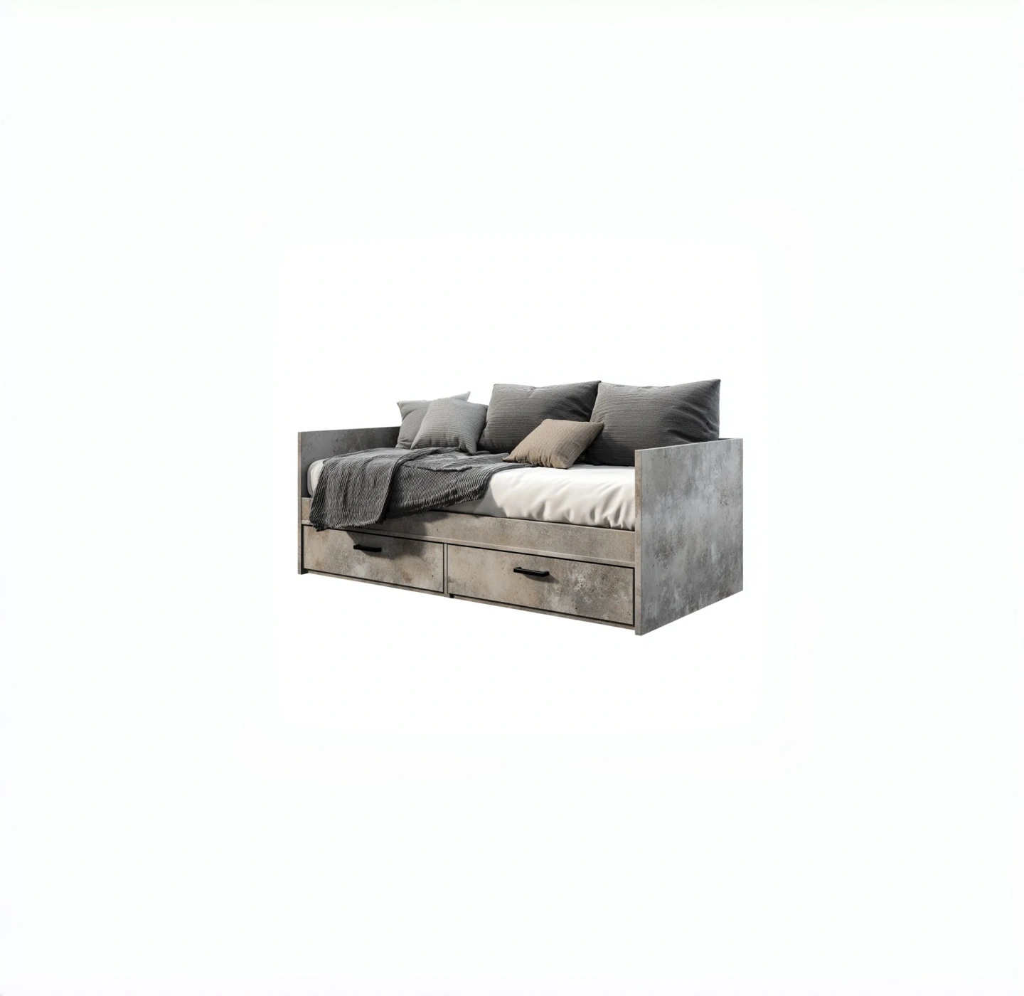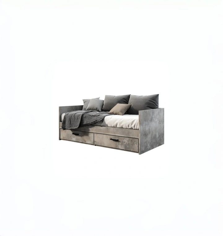 Designed with a sofa-style back and side rails, the unit functions as both a sofa and a sleeping bed, suitable for relaxation and overnight accommodation.